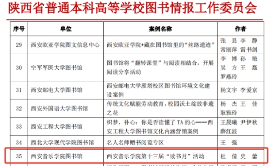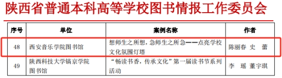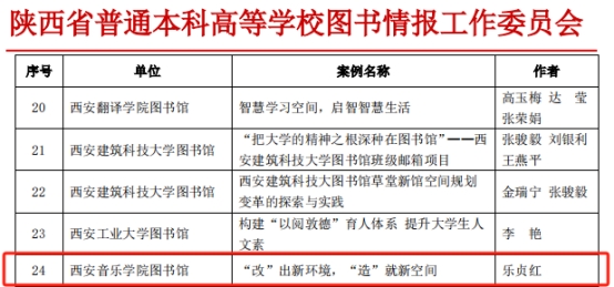 其中馆员乐贞红参评的《“改”出新环境,“造”就新空间 》荣获三等奖,馆员史蕾、陈丽春、杜倩参评的《西安音乐学院第十三届“读书月”活动 》《想师生之所想,急师生之所急——点亮学校文化氛围灯塔》荣获优秀奖。此次活动旨在搭建高校间学习交流平台,促进一线馆员服务能力提升,为推动高校图书馆建设助力增效。