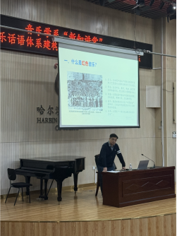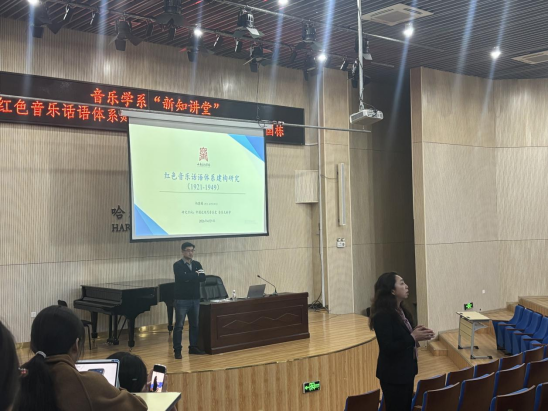 2026年4月1日,哈尔滨音乐学院音乐学系“新知讲堂”2026年第一期学术活动特邀我馆副馆长、副研究员杨国栋担任主讲嘉宾,以《红色音乐话语体系建构研究(1921—1949)》为题,为音乐学系师生带来了一场红色音乐文化主题讲座。